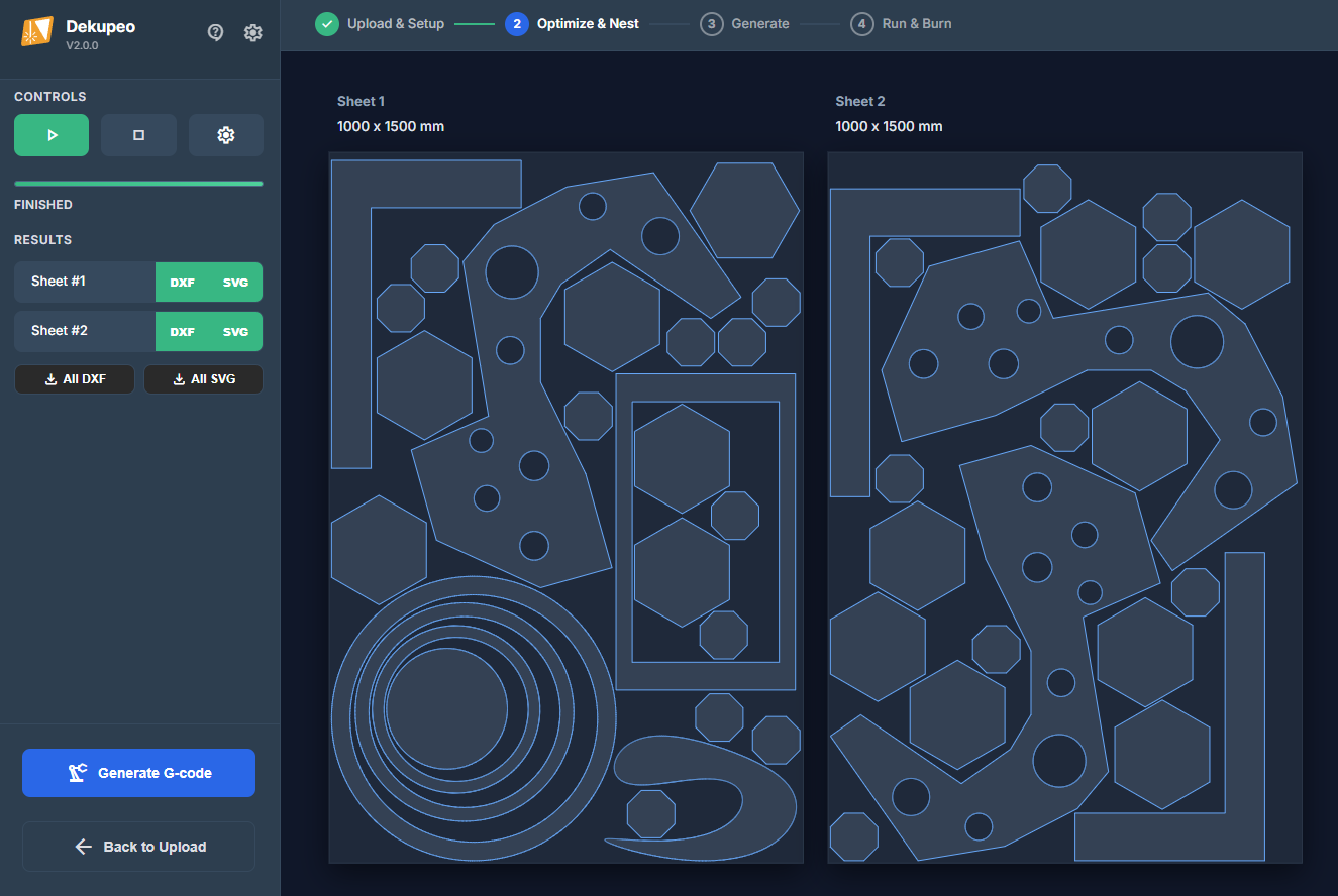 - Sobald das Nesting abgeschlossen ist, können Sie die Ergebnisse überprüfen und sie einzeln als DXF-Dateien exportieren oder die Ergebnisse als ZIP-Archiv für alle Platten herunterladen.