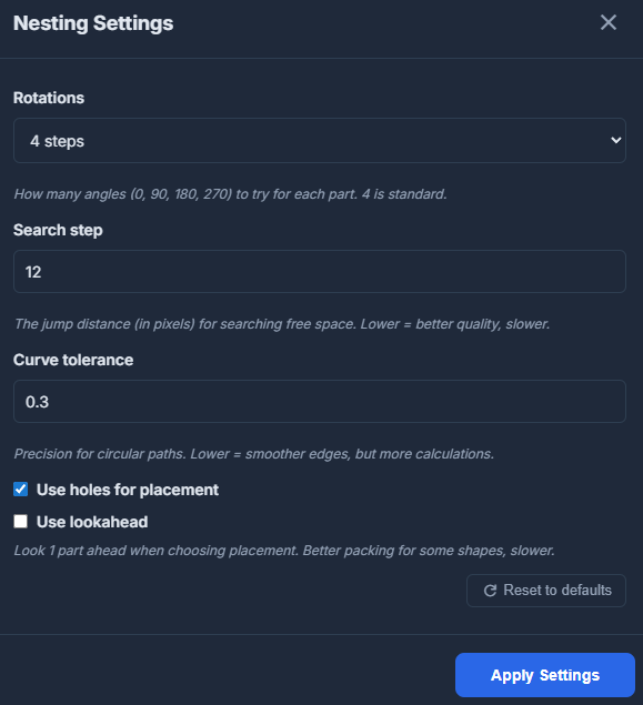 In den Nesting-Einstellungen können Sie verschiedene Parameter konfigurieren, die die Arbeitsweise des Algorithmus beeinflussen. Normalerweise müssen Sie diese nicht anpassen, aber bei bestimmten Teiltypen können Sie durch Feinabstimmung bessere Ergebnisse erzielen. Bei Bedarf können Sie die Werte auf die Standardeinstellungen zurücksetzen.
