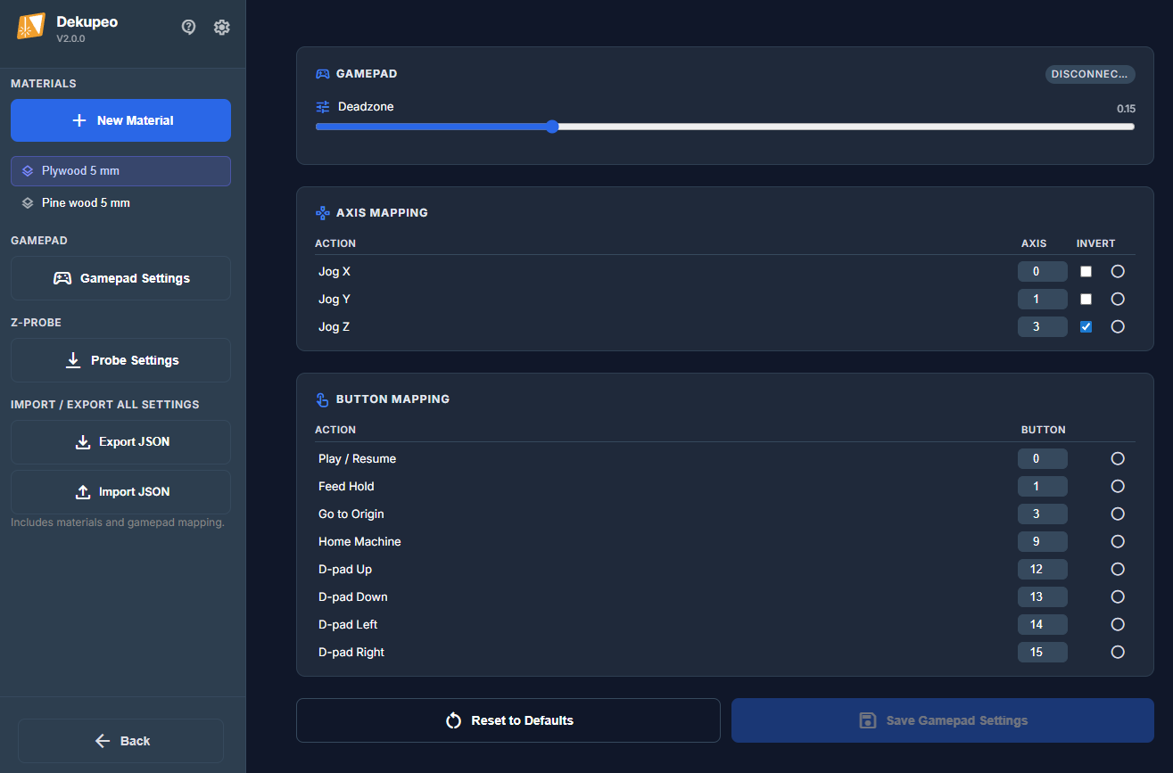 - Achsenzuordnung – Weisen Sie die Sticks Ihres Gamepads der Steuerung von X-, Y- und Z-Bewegungen zu. Sie können die Richtungen bei Bedarf auch invertieren.