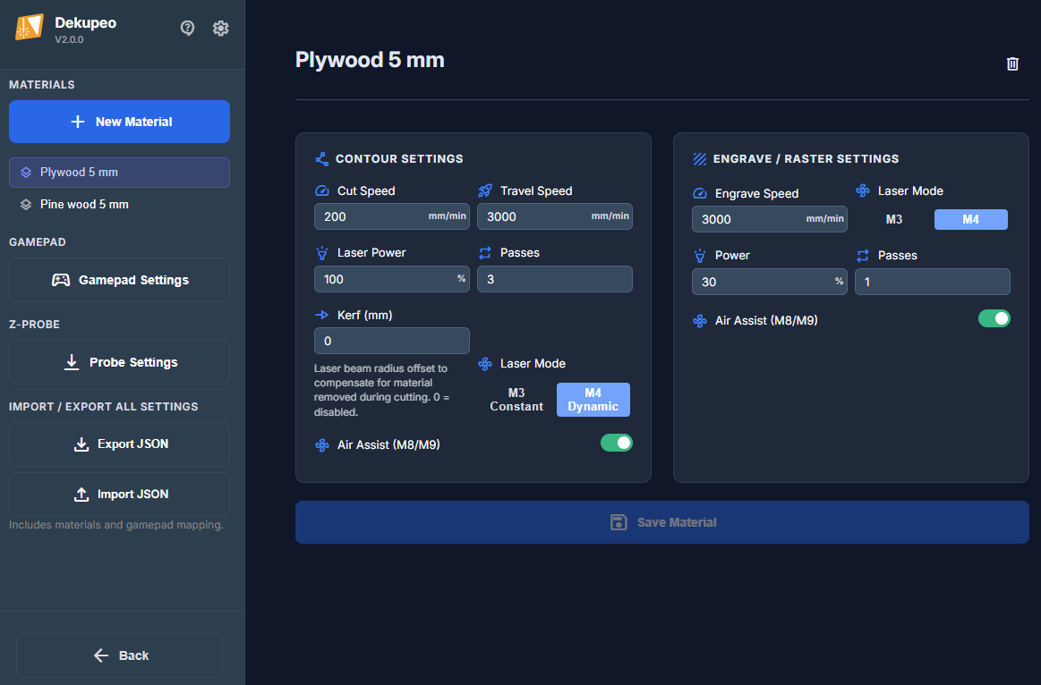 Voreinstellungen (Presets) ermöglichen es Ihnen, verifizierte Geschwindigkeits- und Leistungseinstellungen für verschiedene Materialien zu speichern (z. B. „Sperrholz 3mm“, „Acryl 5mm“).