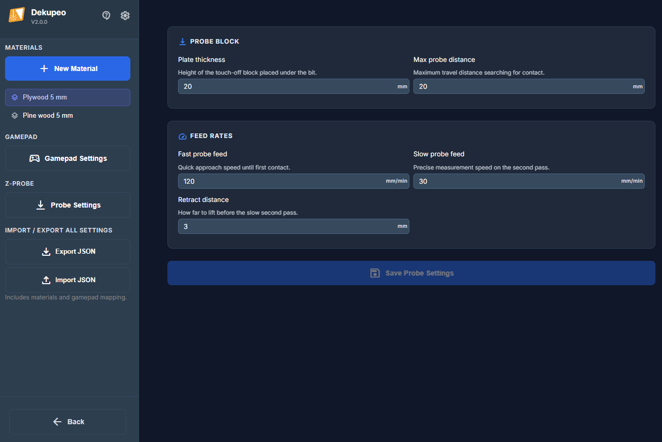 Auf der Seite „Einstellungen“ können Sie Materialvoreinstellungen verwalten, Ihr Gamepad für das manuelle Jogging konfigurieren und Ihre Z-Sonden-Parameter festlegen.